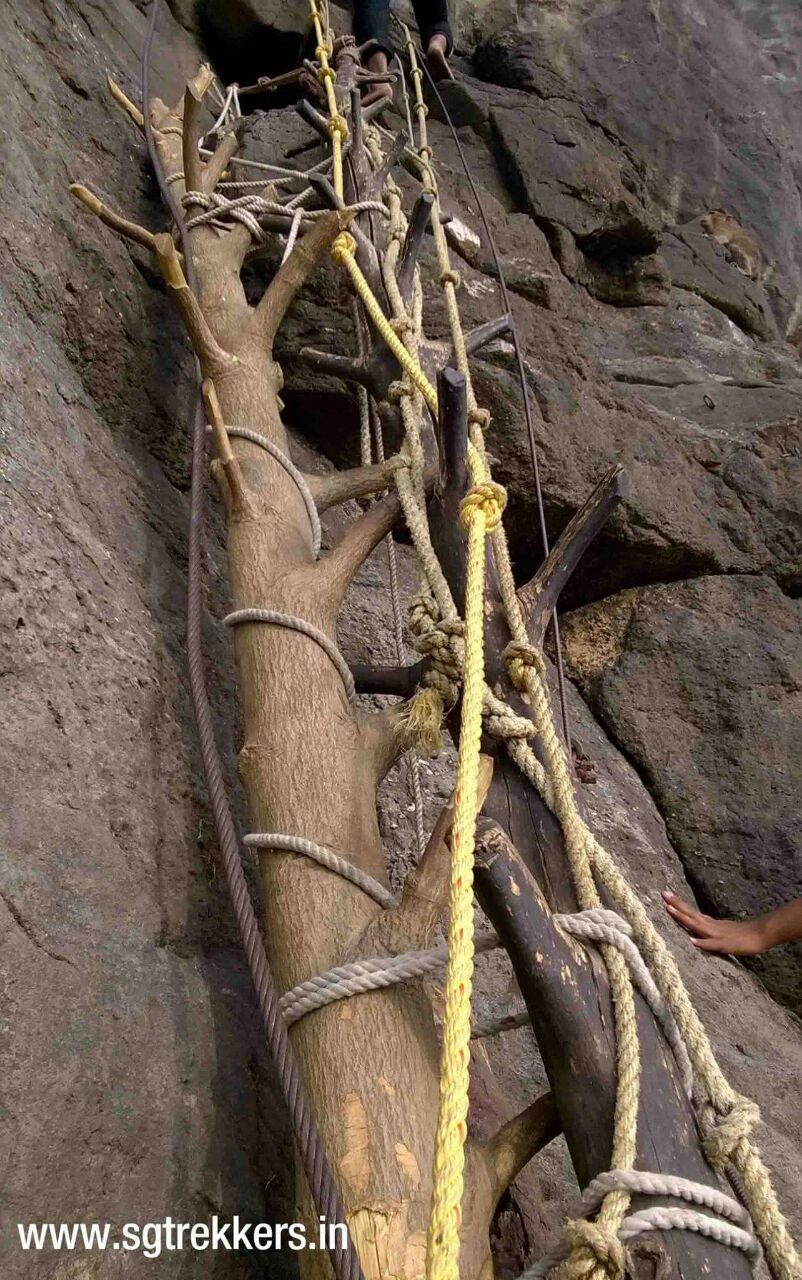 दगडात कोरलेली एक शिडी चढायची होती. दगडात खाचा आहेत आणि एका बाजूला रोप आधारासाठी